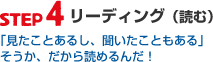 まずは「聞く」ことからスタート。ステップワールドの独自の音声・映像一体型教材で、たくさんの英語をシャワーのようにお子様に浴びせて、英語独自の「音」「リズム」がしみ込むようにします。 |